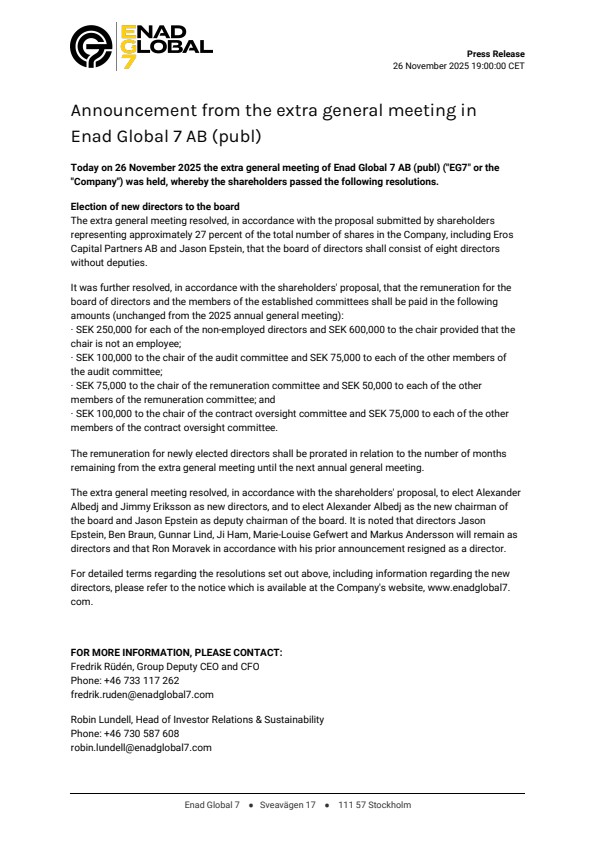 Today on 26 November 2025 the extra general meeting of Enad Global 7 AB (publ) ("EG7" or the "Company") was held, whereby the shareholders passed the following resolutions.