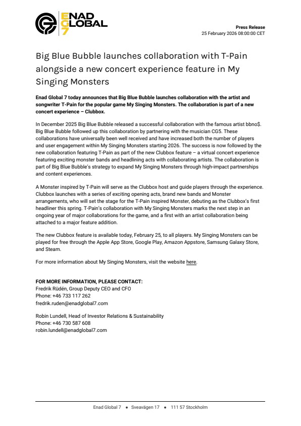 In December 2025 Big Blue Bubble released a successful collaboration with the famous artist bbno$. Big Blue Bubble followed up this collaboration by partnering with the musician CG5. These collaborations have universally been well received and have increased both the number of players and user engagement within My Singing Monsters starting 2026. The success is now followed by the new collaboration featuring T-Pain as part of the new Clubbox feature – a virtual concert experience featuring exciting monster bands and headlining acts with collaborating artists. The collaboration is part of Big Blue Bubble’s strategy to expand My Singing Monsters through high-impact partnerships and content experiences.
