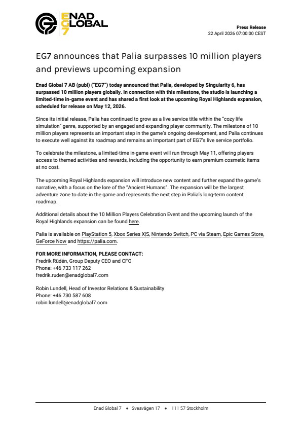 Enad Global 7 AB (publ) (“EG7”) today announced that Palia, developed by Singularity 6, has surpassed 10 million players globally. In connection with this milestone, the studio is launching a limited-time in-game event and has shared a first look at the upcoming Royal Highlands expansion, scheduled for release on May 12, 2026.