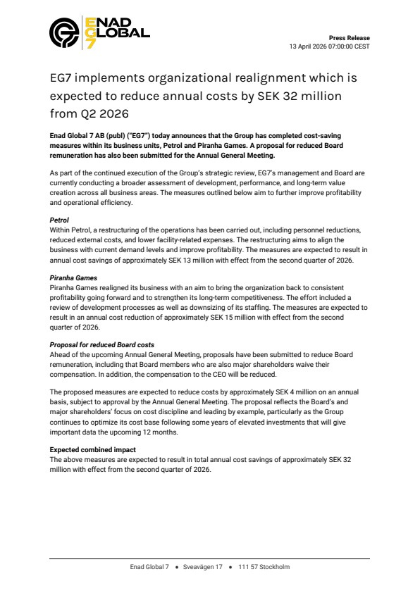 Enad Global 7 AB (publ) (“EG7”) today announces that the Group has completed cost-saving measures within its business units, Petrol and Piranha Games. A proposal for reduced Board remuneration has also been submitted for the Annual General Meeting.