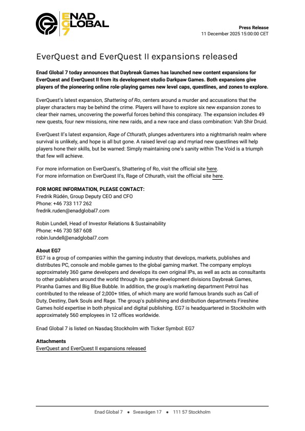 Enad Global 7 today announces that Daybreak Games has launched new content expansions for EverQuest and EverQuest II from its development studio Darkpaw Games. Both expansions give players of the pioneering online role-playing games new level caps, questlines, and zones to explore.