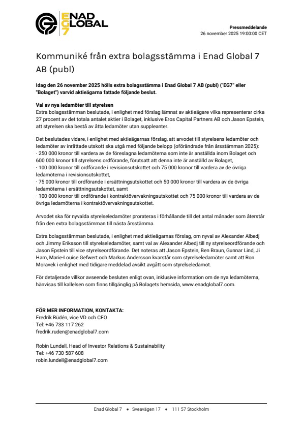 Idag den 26 november 2025 hölls extra bolagsstämma i Enad Global 7 AB (publ) ("EG7" eller "Bolaget") varvid aktieägarna fattade följande beslut.