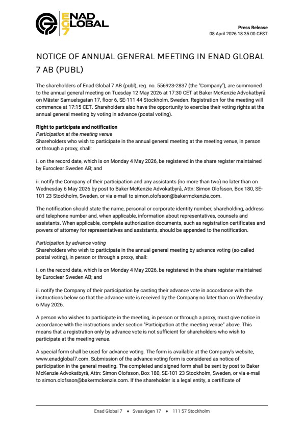 The shareholders of Enad Global 7 AB (publ), reg. no. 556923-2837 (the "Company"), are summoned to the annual general meeting on Tuesday 12 May 2026 at 17:30 CET at Baker McKenzie Advokatbyrå on Mäster Samuelsgatan 17, floor 6, SE-111 44 Stockholm, Sweden. Registration for the meeting will commence at 17:15 CET. Shareholders also have the opportunity to exercise their voting rights at the annual general meeting by voting in advance (postal voting).