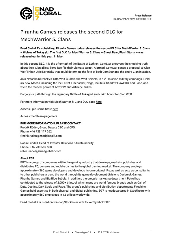 Enad Global 7’s subsidiary, Piranha Games today releases the second DLC for MechWarrior 5: Clans – Wolves of Tukayyid. The first DLC for MechWarrior 5: Clans – Ghost Bear, Flash Storm – was released earlier this year, in May.